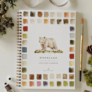 Pictured is a Camping Watercolor Workbook by Emily Lex sold at The Hare & The Hart in downtown Thomasville, Georgia. It has an illustration of a camping pack with watercolor paint swatches around it. The cover reads, "CAMPING watercolor workbook". It is surrounded by a paintbrush, a fir tree branch, and a flower.