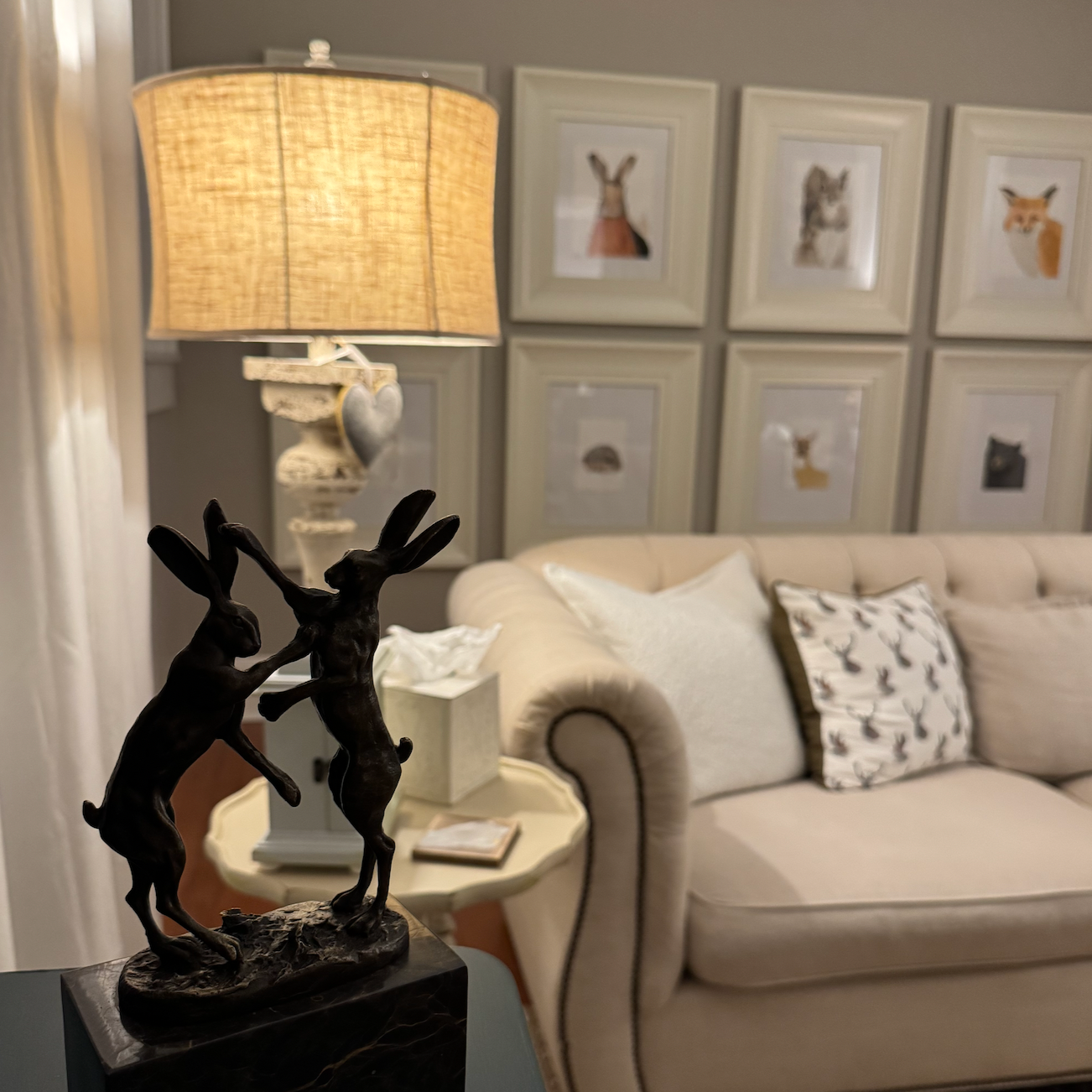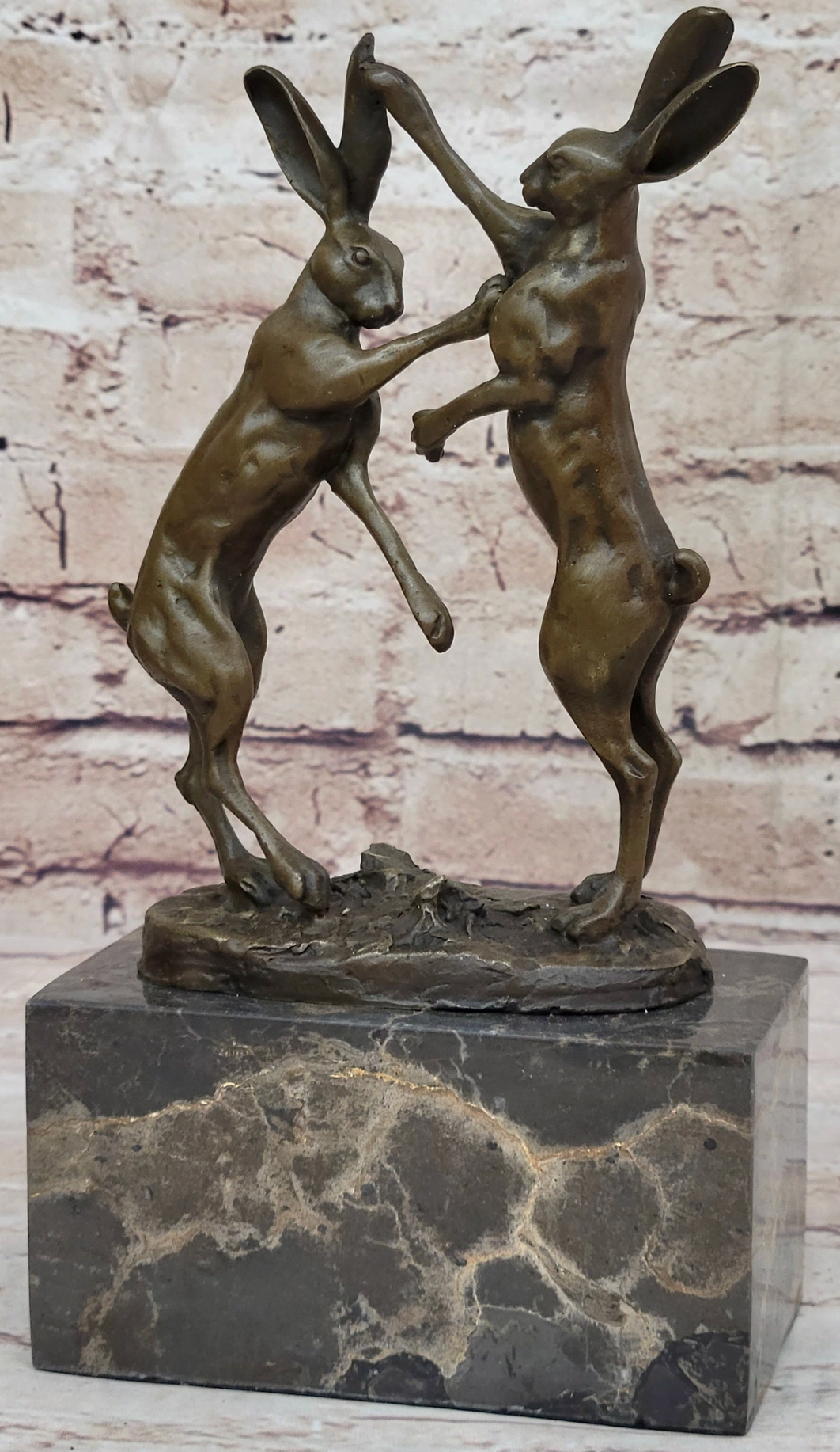 A captivating bronze sculpture that portrays a unique interaction between two hares, transcending their typical shy nature. In this artwork, the shyness is set aside as the hares engage in a spirited and dynamic fight. Standing on their hind legs, they playfully or assertively swat at each other with their front legs, creating a lively and engaging scene. Their long ears extend outward, adding to the charm and realism of the sculpture.