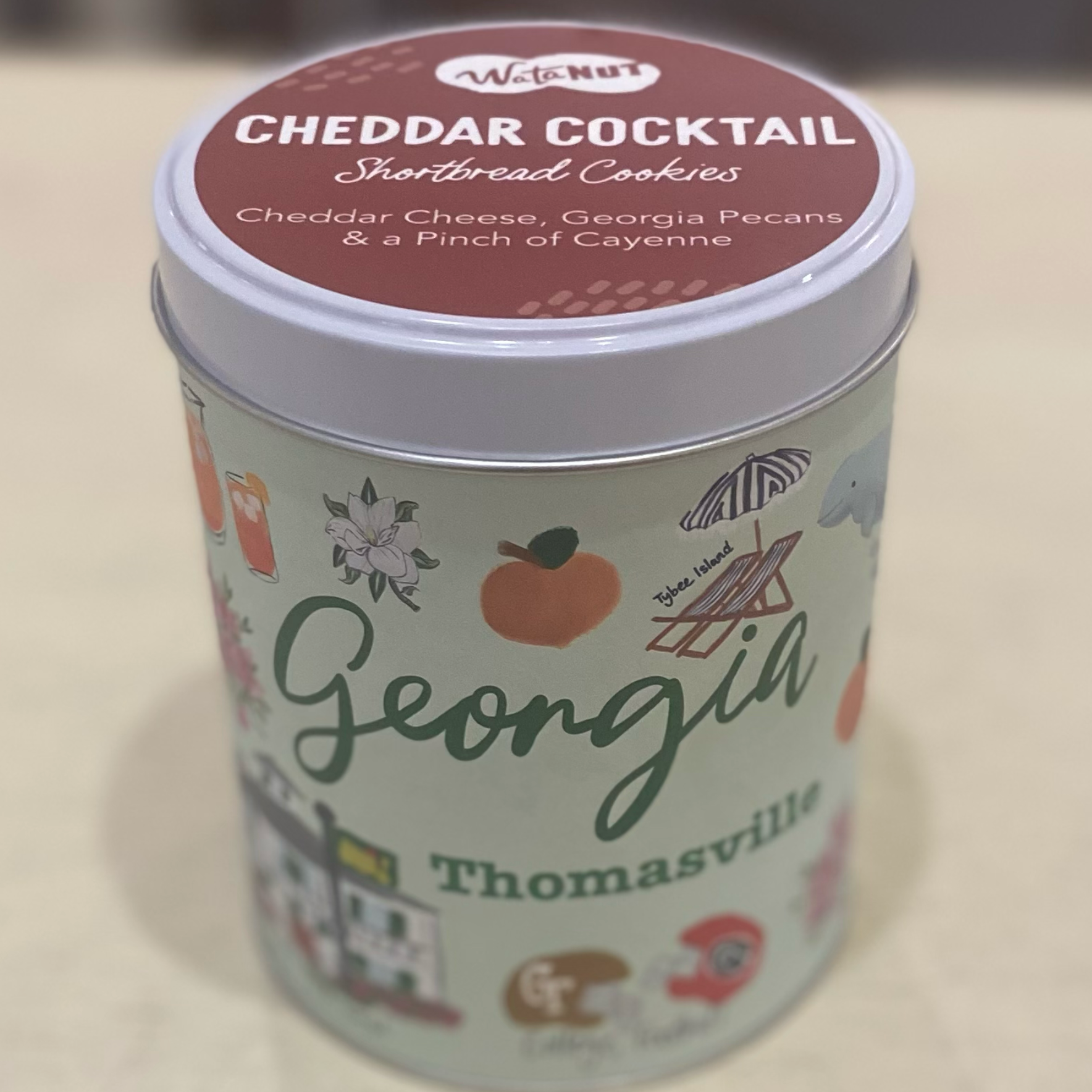 This tin is a delightful little work of art filled with delicious savory cheddar cocktail cookies made with cheddar cheese, Georgia pecans, and a pinch of cayenne.