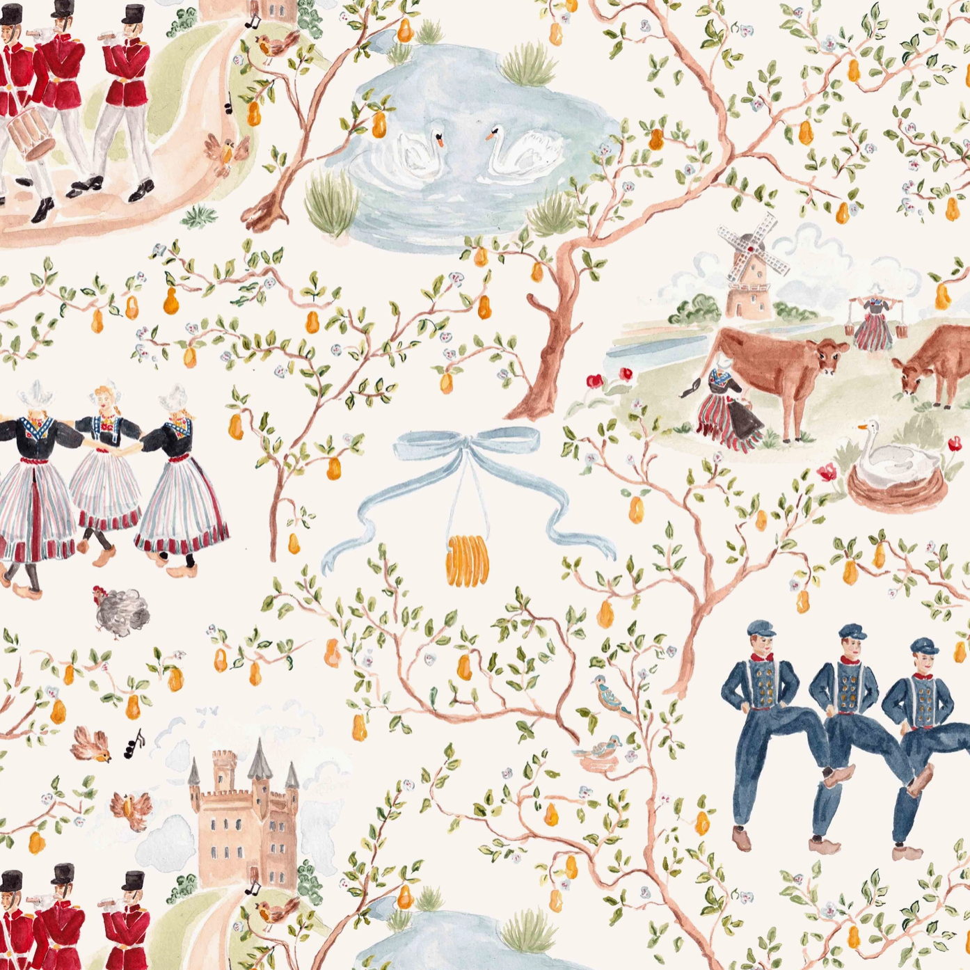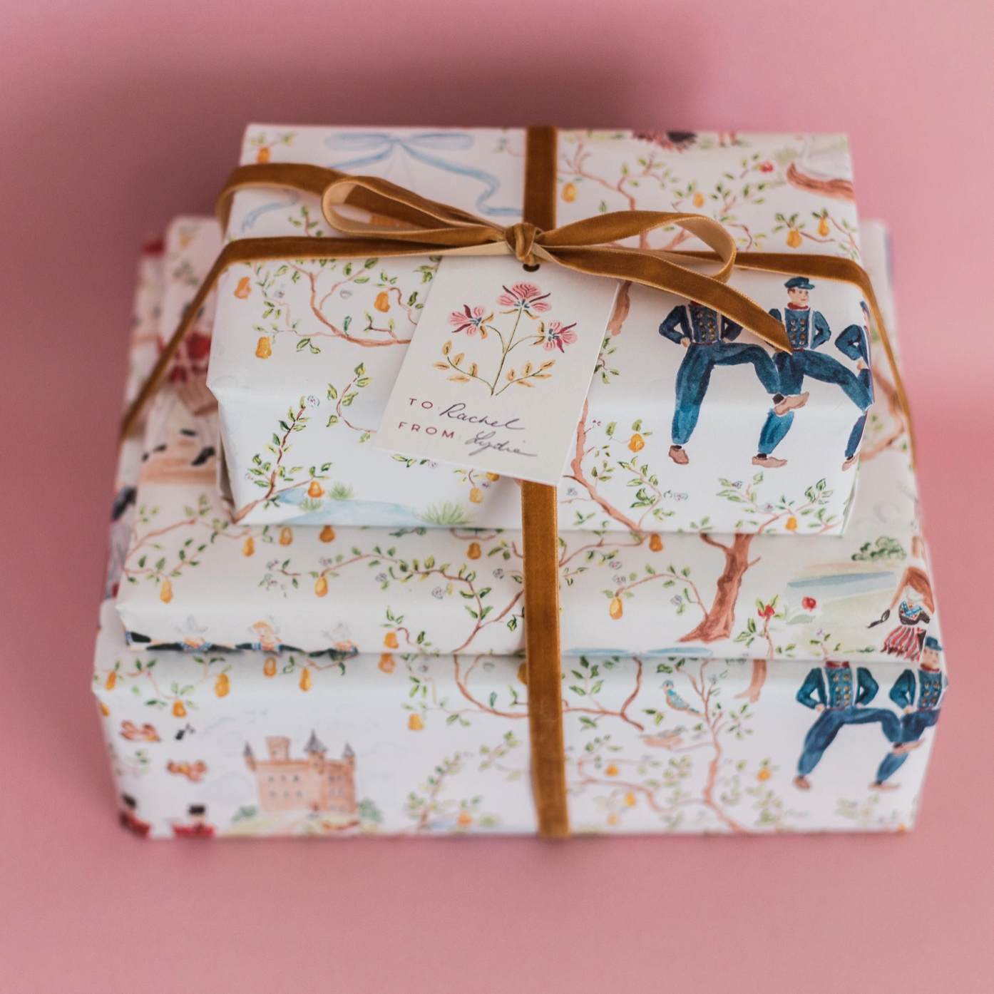 This gift wrap by The Illustrated Life features all the gifts of Christmas with a Dutch-inspired twist. Pipers and drummers pipe and drum, and lords and ladies a-leap and a-dance through a pear tree motif that features a partridge, two turtledoves and their nest, three French hens, four calling birds, and five gold rings, plus a goose and swans, all wrapped up with pretty a bow. Full of holiday charm, this unique toile is sure to delight this Christmas!