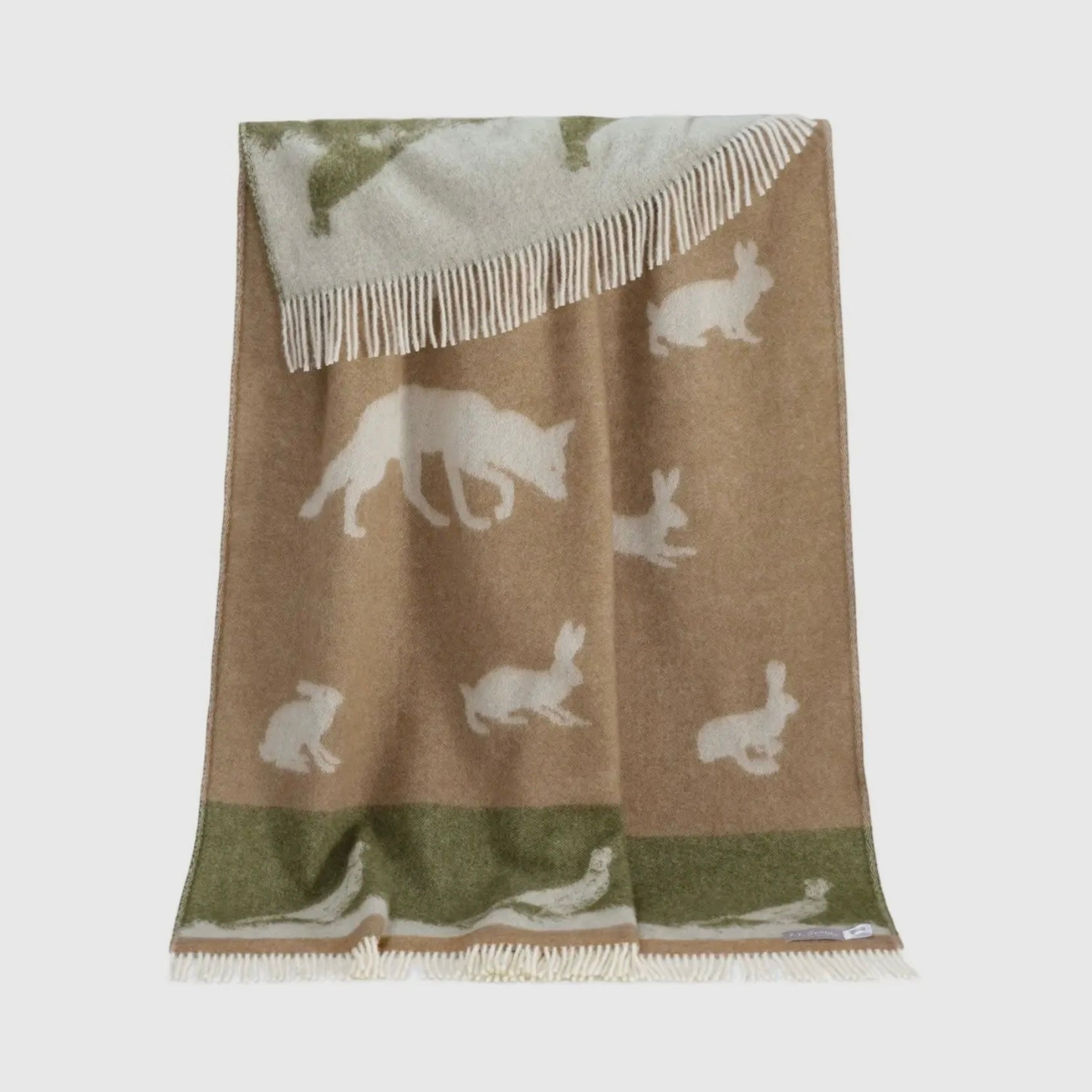 Rediscover the charm of the countryside with this country throw, this piece is adorned with a classic array of animals typically found in the British countryside: foxes, hares, and pheasants.
