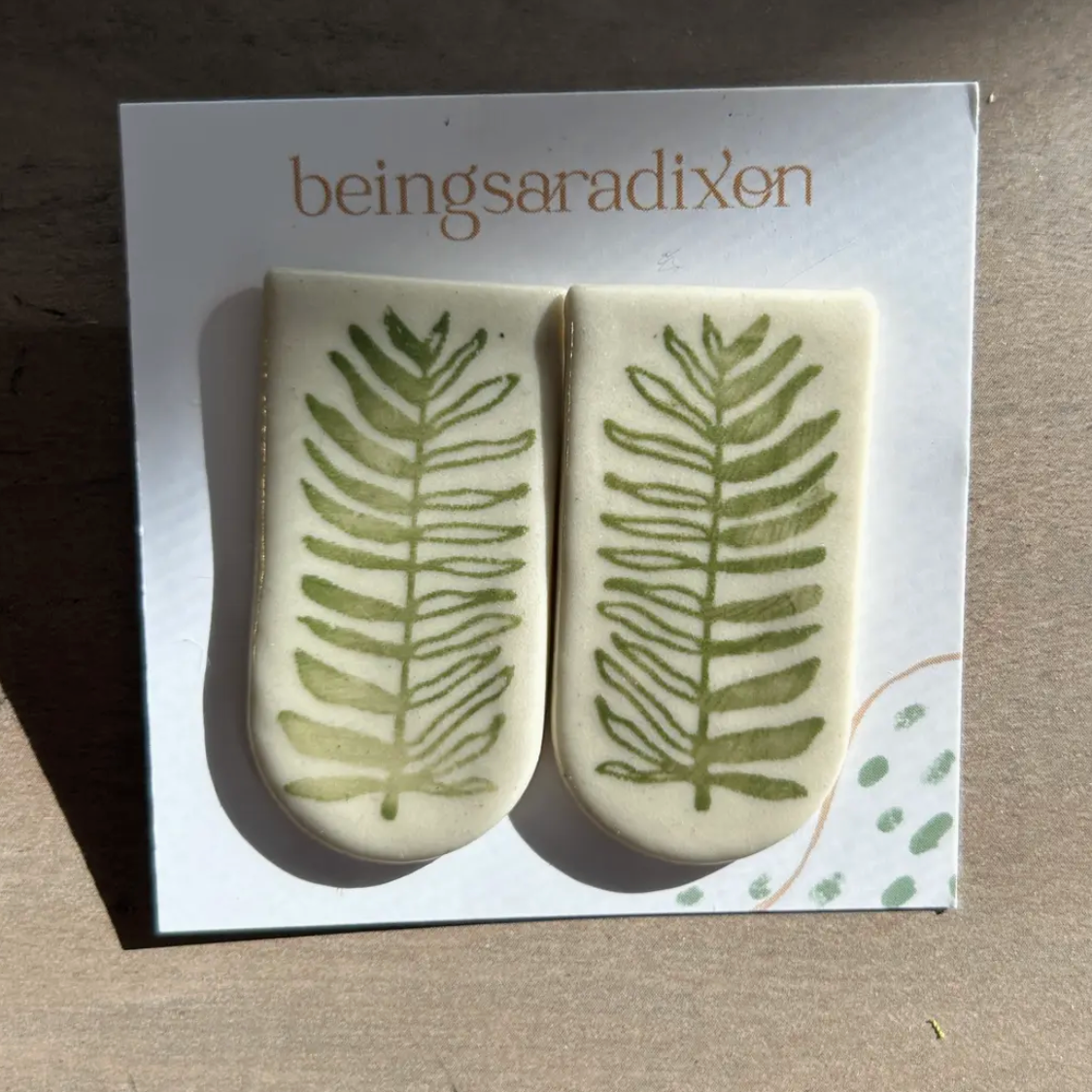 Elevate your style with stunning porcelain fern earrings by Being Sara Dixon Studio. Pine green ferns are intricately crafted onto the ceramic surface, creating a bold and eye-catching statement piece. The pine green hue is both soothing and striking, and adds visual interest and depth on the porcelain. They're surprisingly lightweight and easy to wear, making them perfect for all day wear.