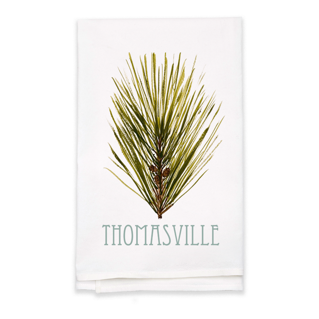 Bring a touch of Thomasville to your kitchen with this lightweight, absorbent flour sack tea towel featuring a longleaf pine watercolor painting.