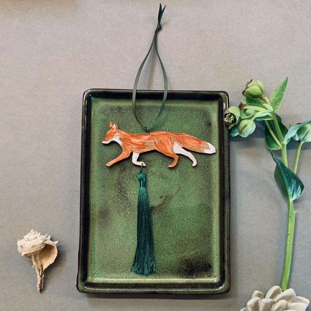 This hand painted Fox tassel decoration, brings a touch of woodland joy to your home. With a flourish of laser etched illustrated details, and a frivolous tassel, this little fellow doesn’t have to be just for Christmas.