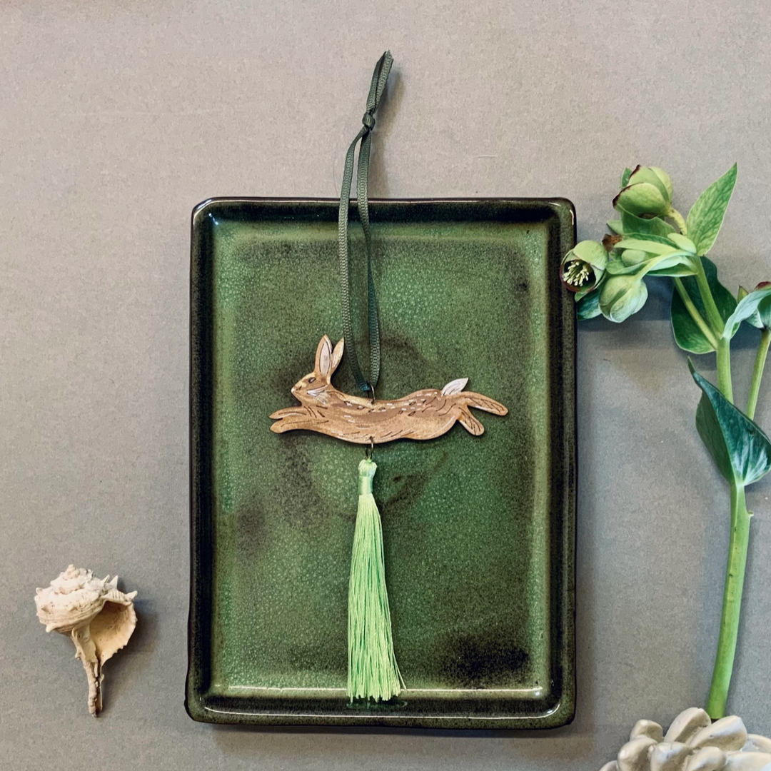 This hand painted Hare tassel decoration, brings a touch of woodland joy to your home. With a flourish of laser etched illustrated details, and a frivolous tassel, this little fellow doesn’t have to be just for Christmas.