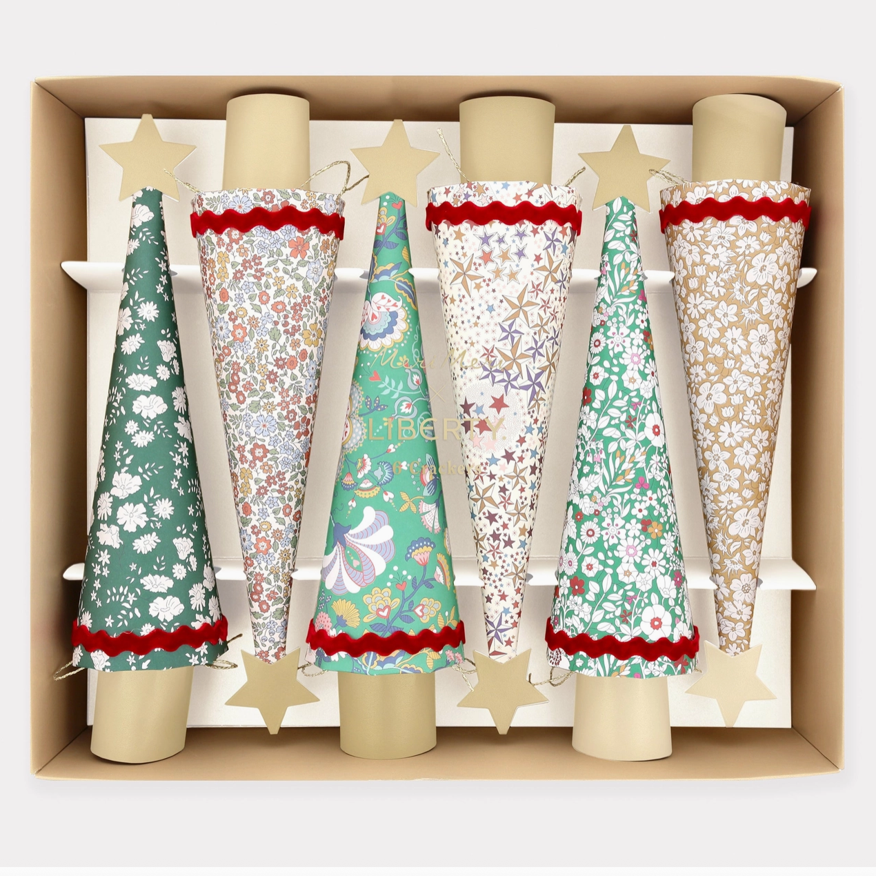 6 Tree-shaped Christmas crackers with different Liberty floral and star prints