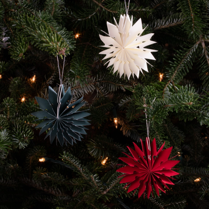 Set of 6 paper snowflake ornaments, each 4 inches across.