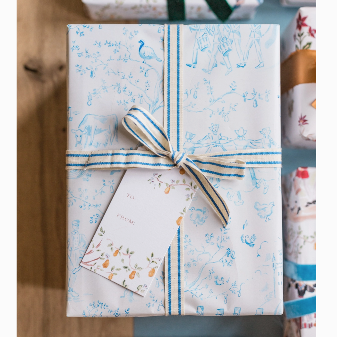 Deck your gifts with these charming watercolor gift tags, which feature the pear tree motif in The Illustrated Life's 12 Days of Christmas wrapping paper design.