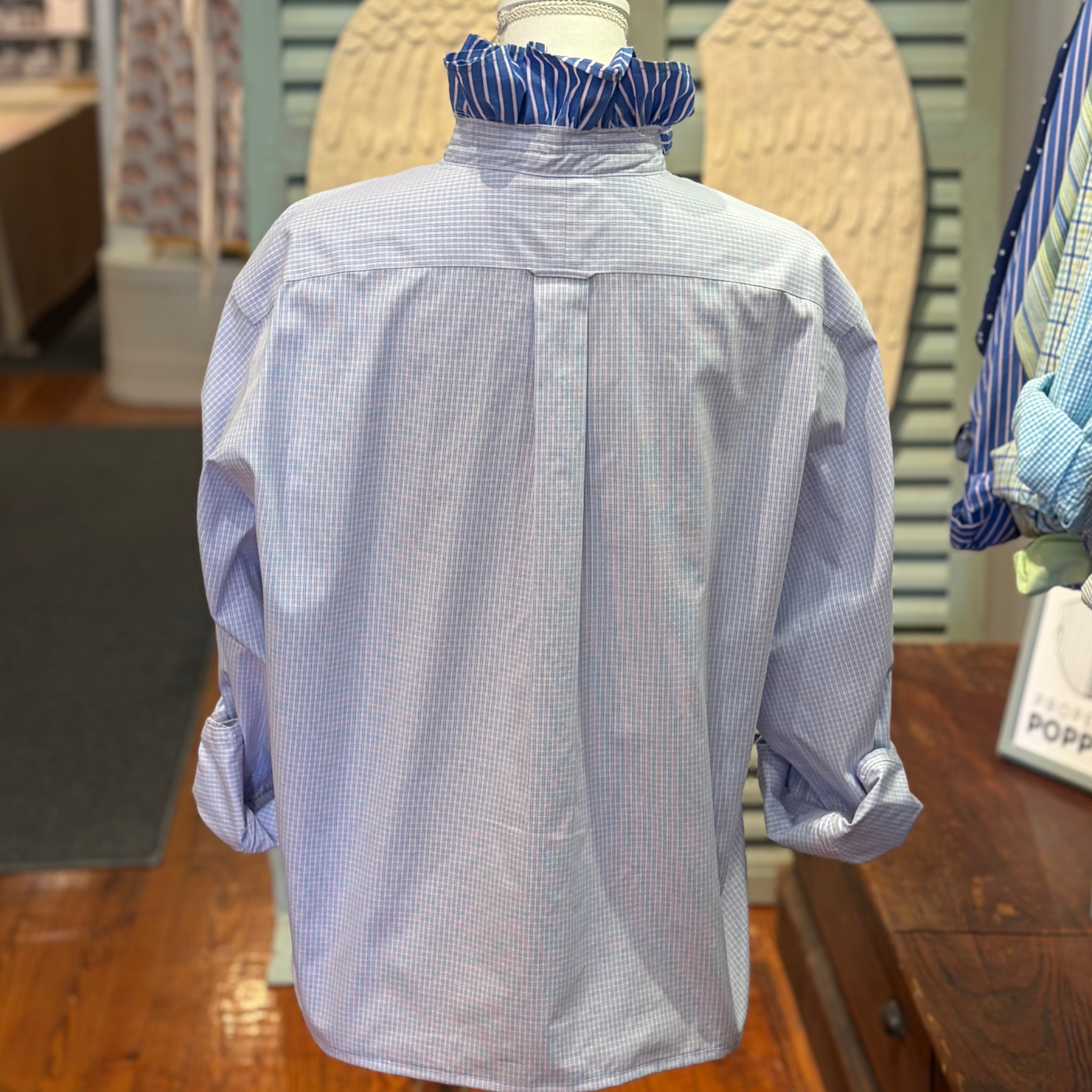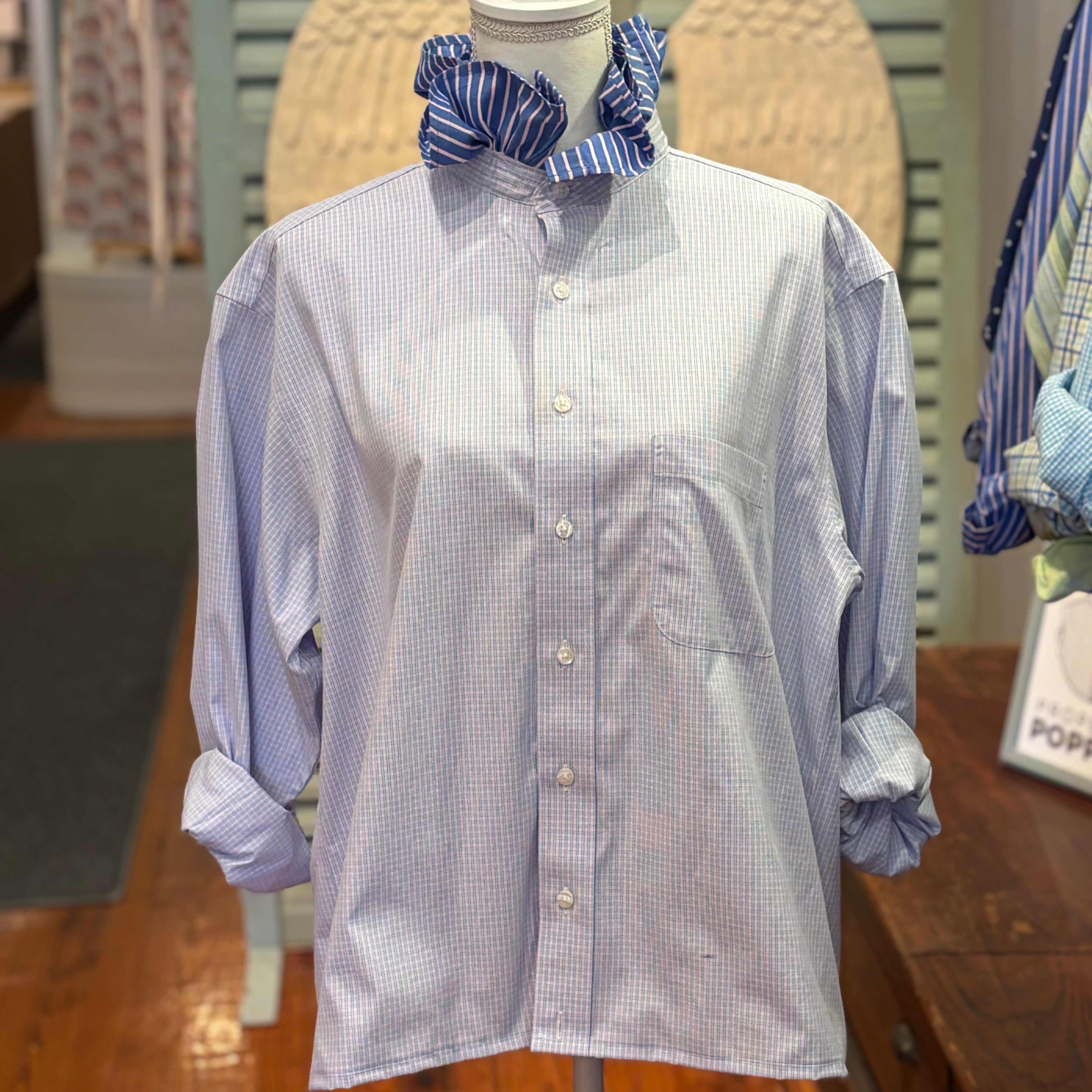 A collar shouldn't just sit there - it should stand up. We scout the finest legacy shirting and give it a radical promotion: a leveled hem, an intentional pattern clash, and our signature ruffled collar.