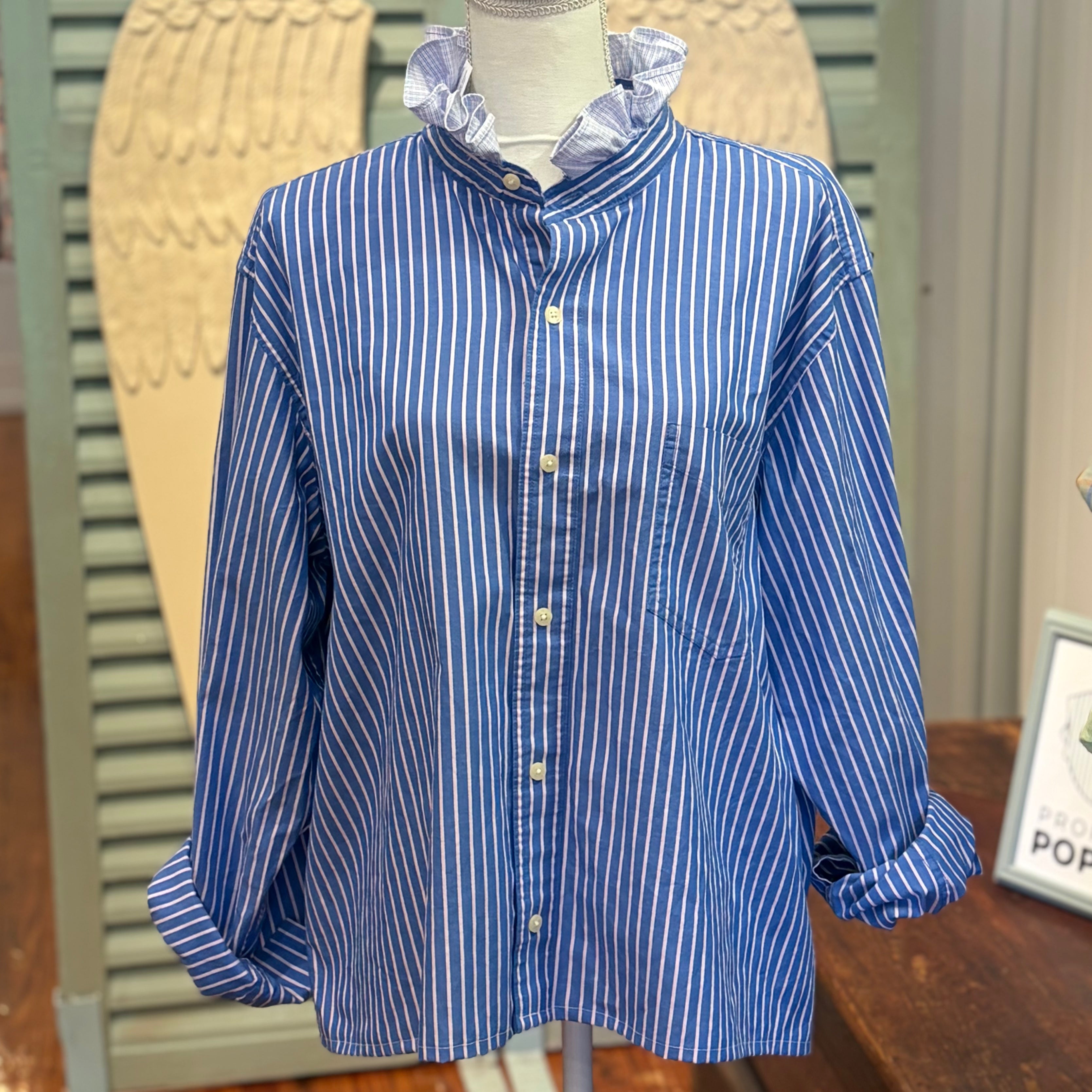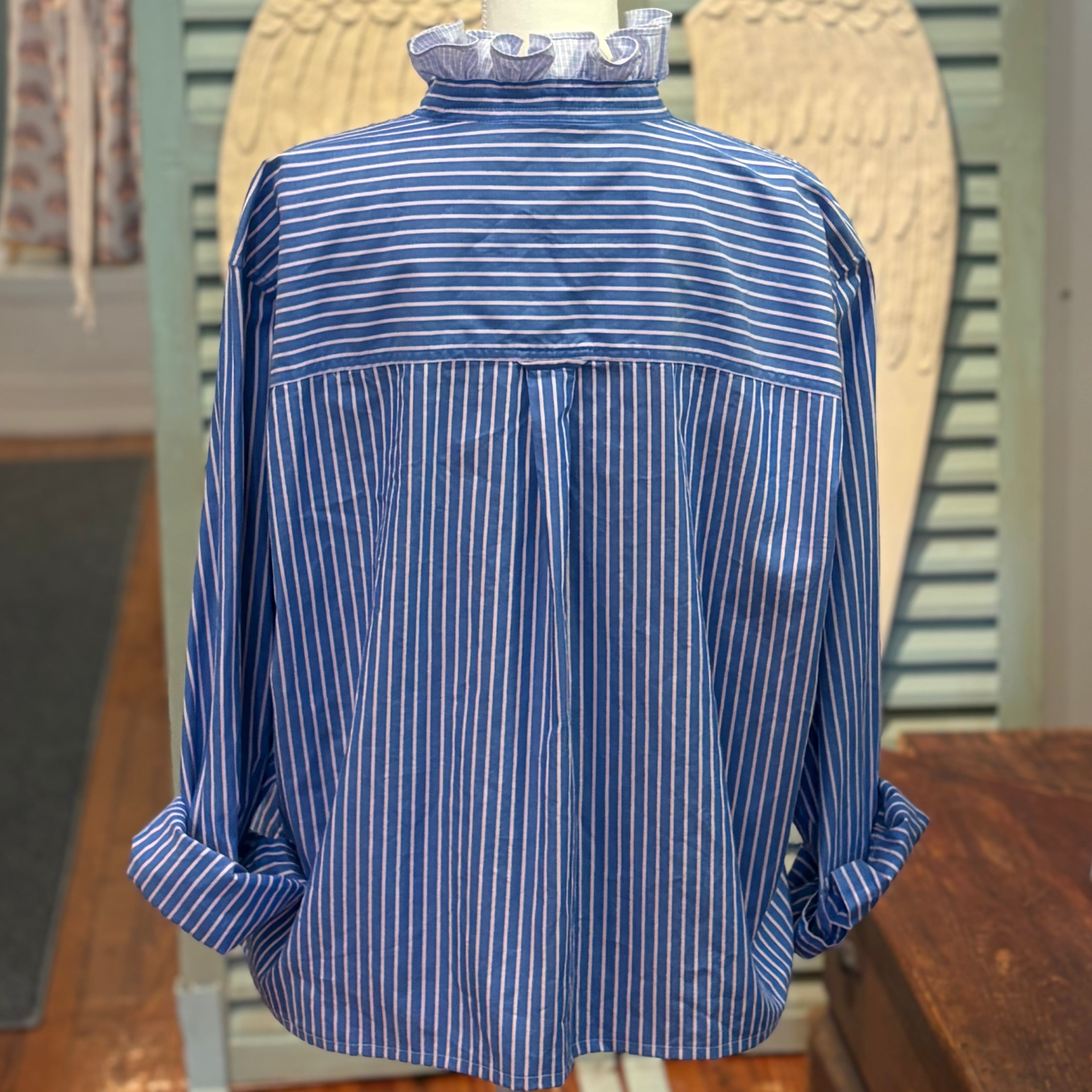 A collar shouldn't just sit there - it should stand up. We scout the finest legacy shirting and give it a radical promotion: a leveled hem, an intentional pattern clash, and our signature ruffled collar.