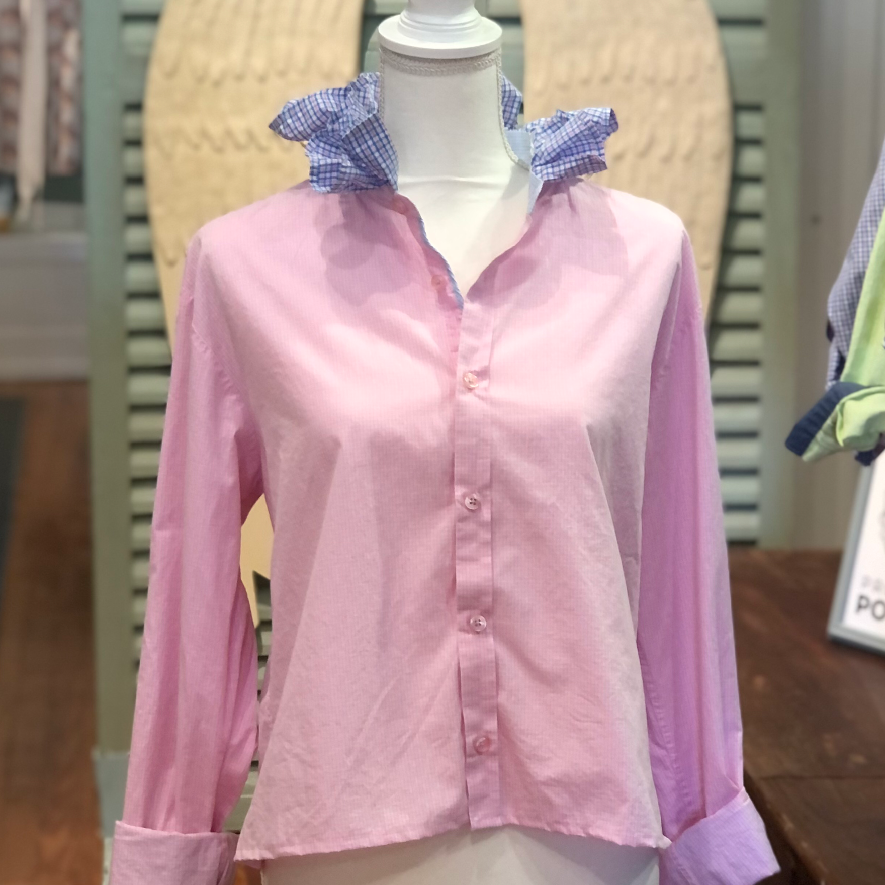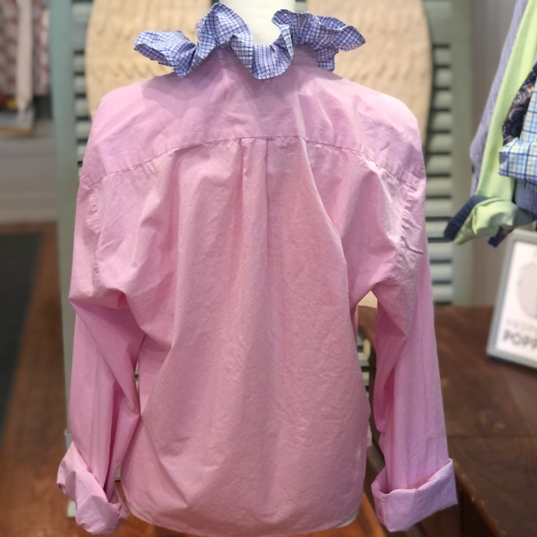 A collar shouldn't just sit there - it should stand up. We scout the finest legacy shirting and give it a radical promotion: a leveled hem, an intentional pattern clash, and our signature ruffled collar.