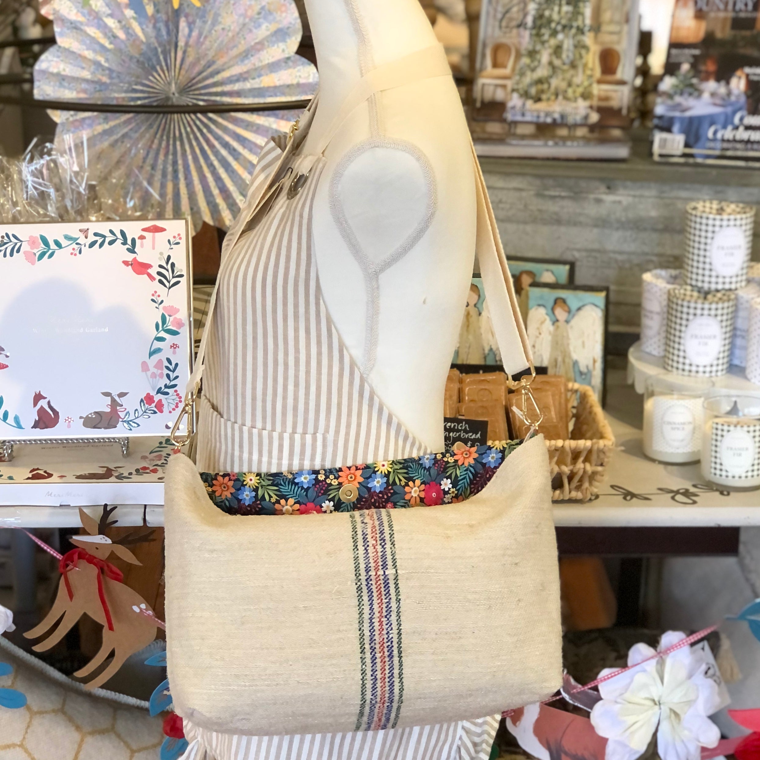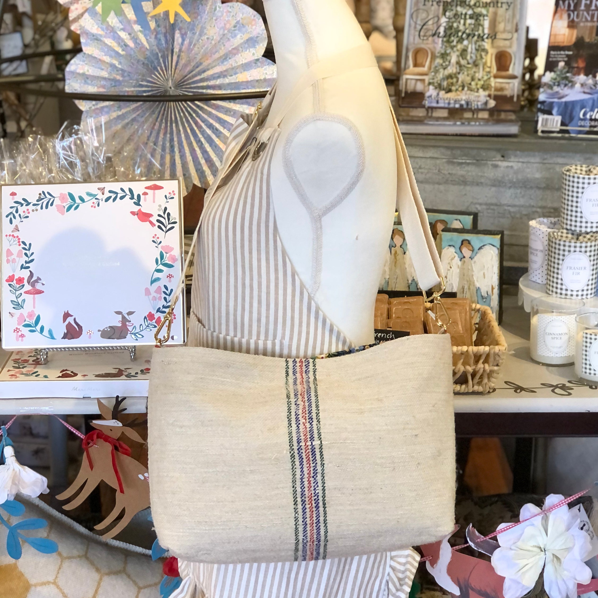 These totes are made locally by The Tuckered Elephant from beautiful, authentic, European grain sacks dating back to the early 1900s.