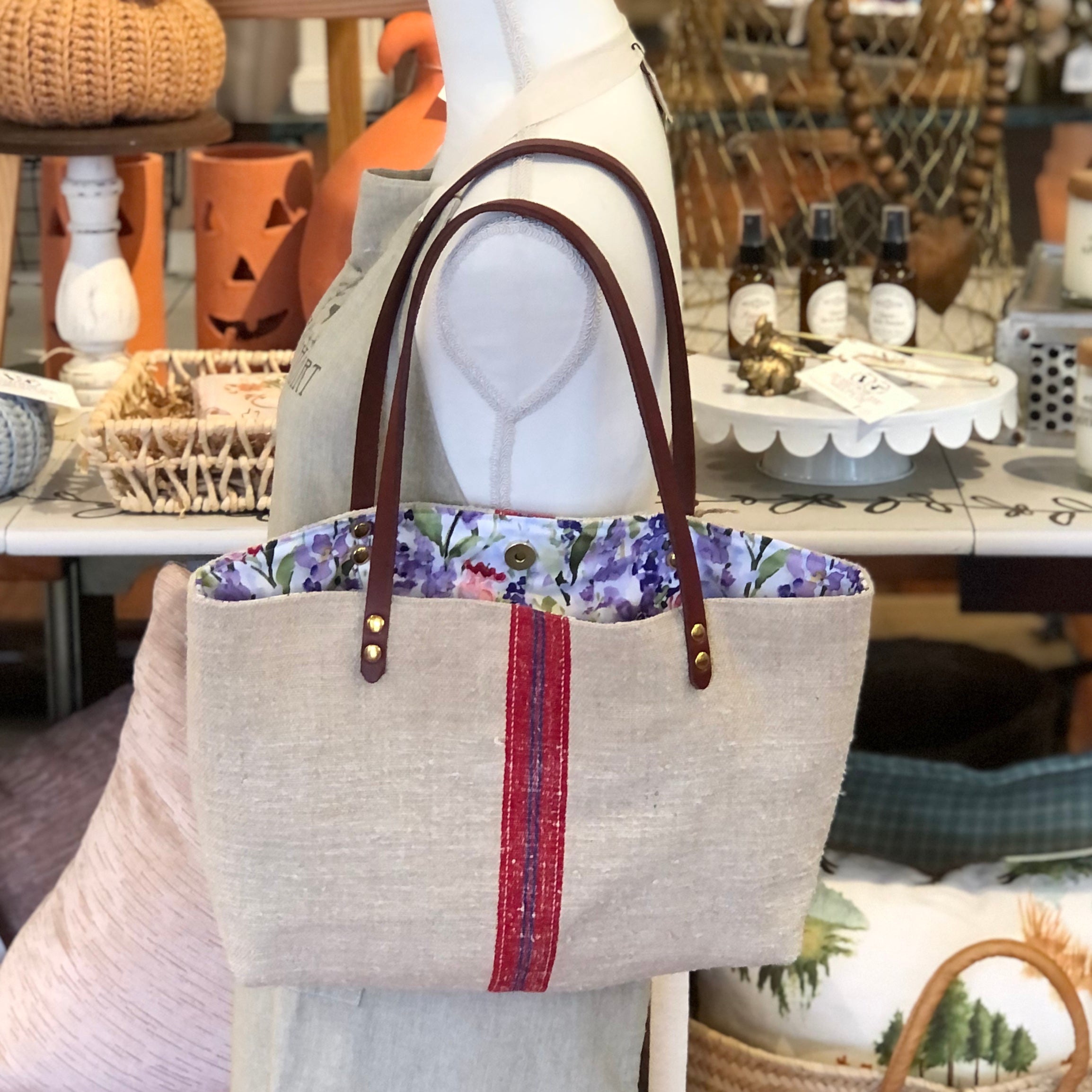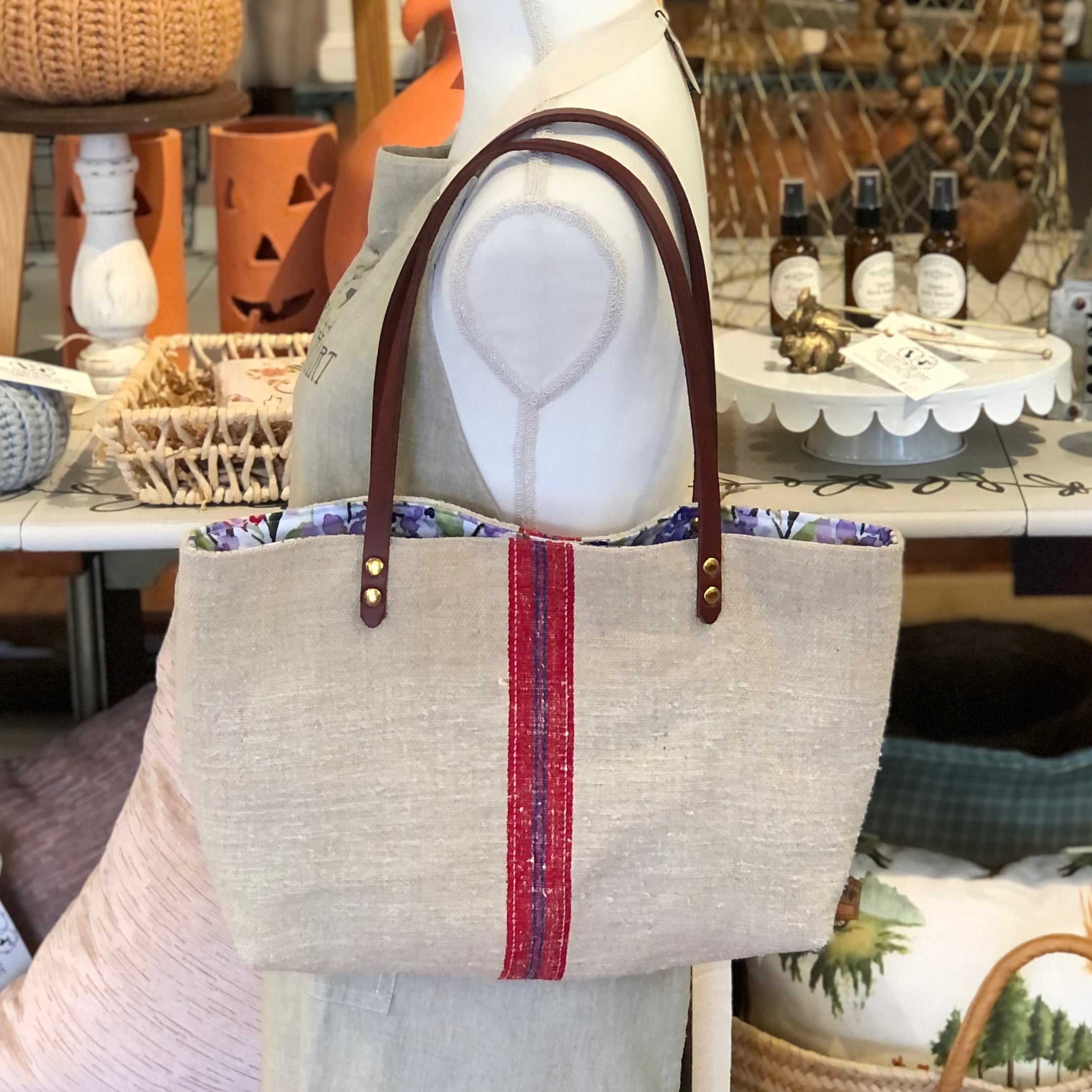 These totes are made locally by The Tuckered Elephant from beautiful, authentic, European grain sacks dating back to the early 1900s.