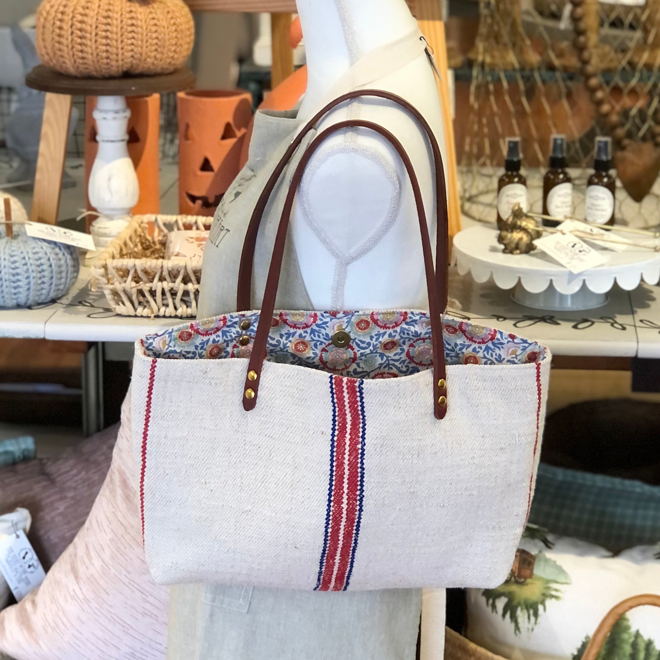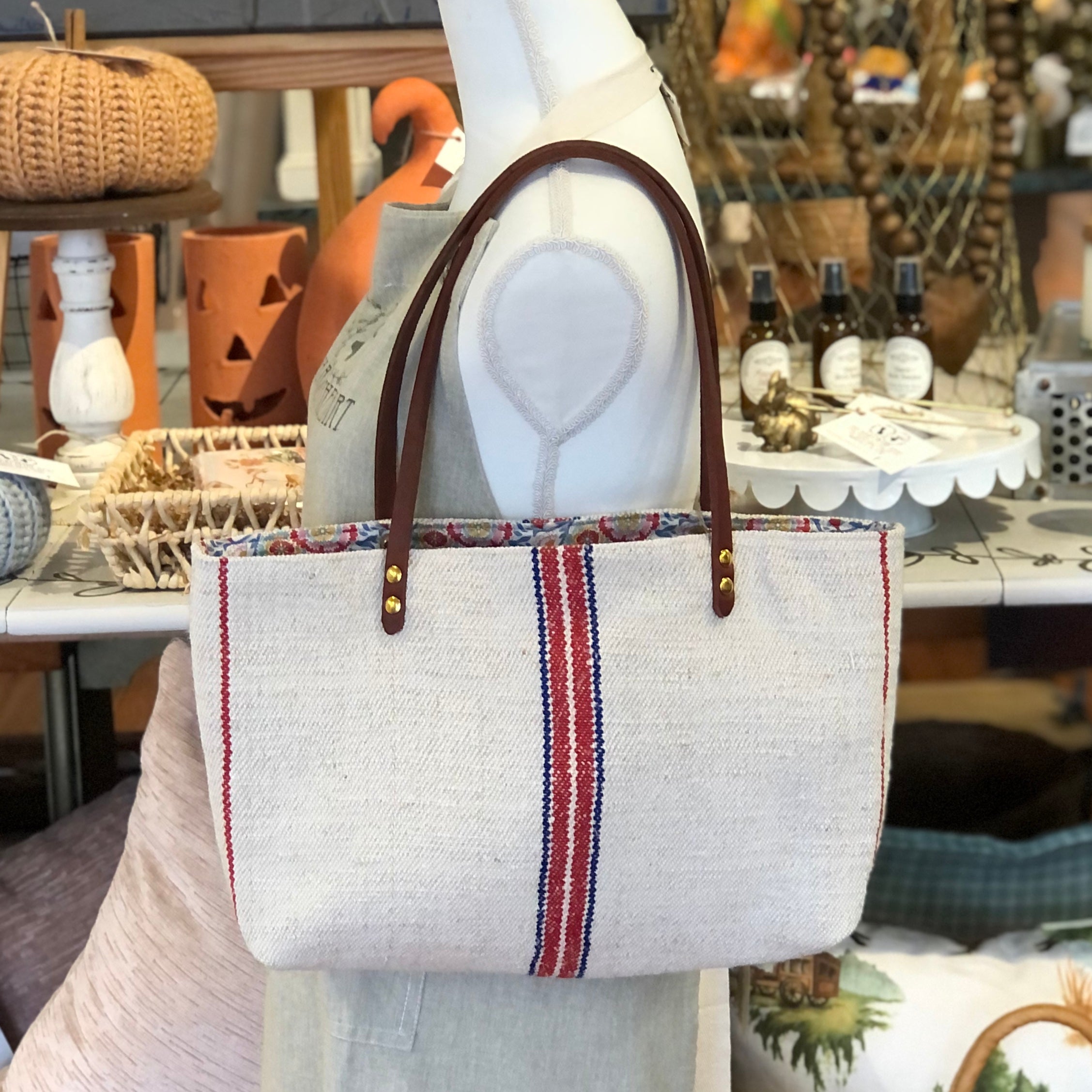 These totes are made locally by The Tuckered Elephant from beautiful, authentic, European grain sacks dating back to the early 1900s.